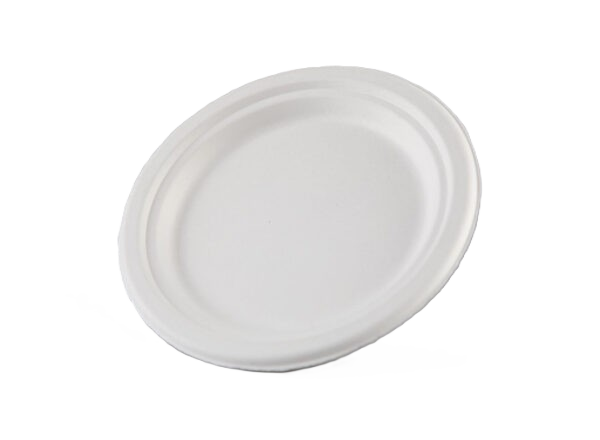 Compostable, disposable dinner plate made from renewable sugar cane pulp.